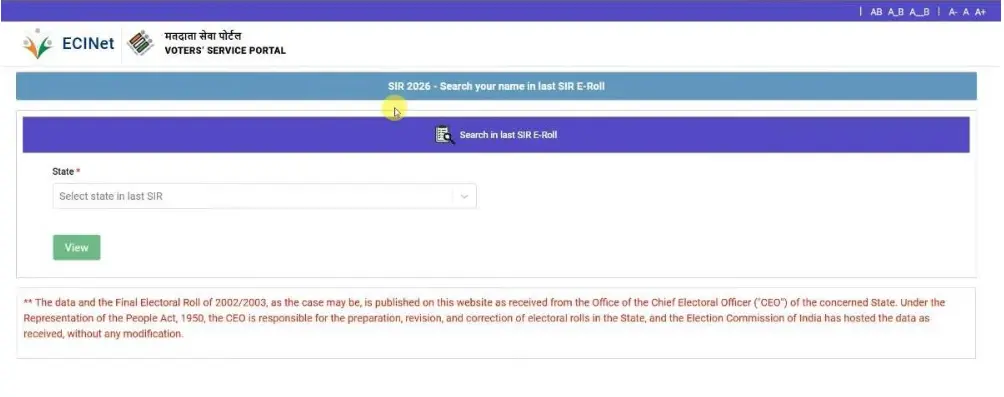 होम पेज पर दिखाई देने वाले ऑप्शन्स में से “Search Your Name in Last SIR” पर क्लिक करें।