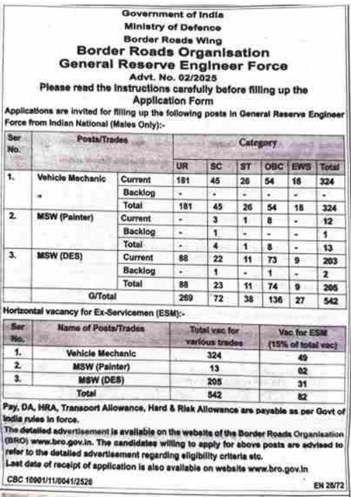 BRO Various Post Recruitment 2025 :- अगर आप कक्षा 10वीं पास हैं और सरकारी नौकरी की तलाश कर रहे हैं, तो आपके लिए शानदार खबर है। सीमा सड़क संगठन (Border Roads Organisation – BRO) ने Vehicle Mechanic और MSW (Painter, DES) जैसे विभिन्न पदों पर भर्ती की आधिकारिक अधिसूचना जारी की है। इस भर्ती के तहत कुल 542 पदों पर नियुक्तियां की जाएंगी। उम्मीदवार 11 अक्टूबर 2025 से 24 नवंबर 2025 तक ऑनलाइन आवेदन कर सकते हैं।