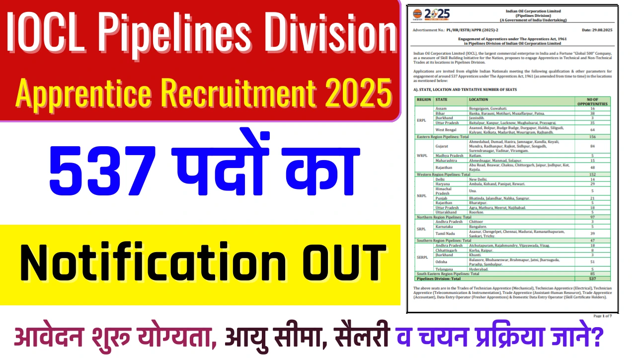 IOCL Pipelines Division Apprentice Recruitment 2025 :- Indian Oil Corporation of India (IOCL) ने Pipelines Division Apprentice Recruitment 2025 के....