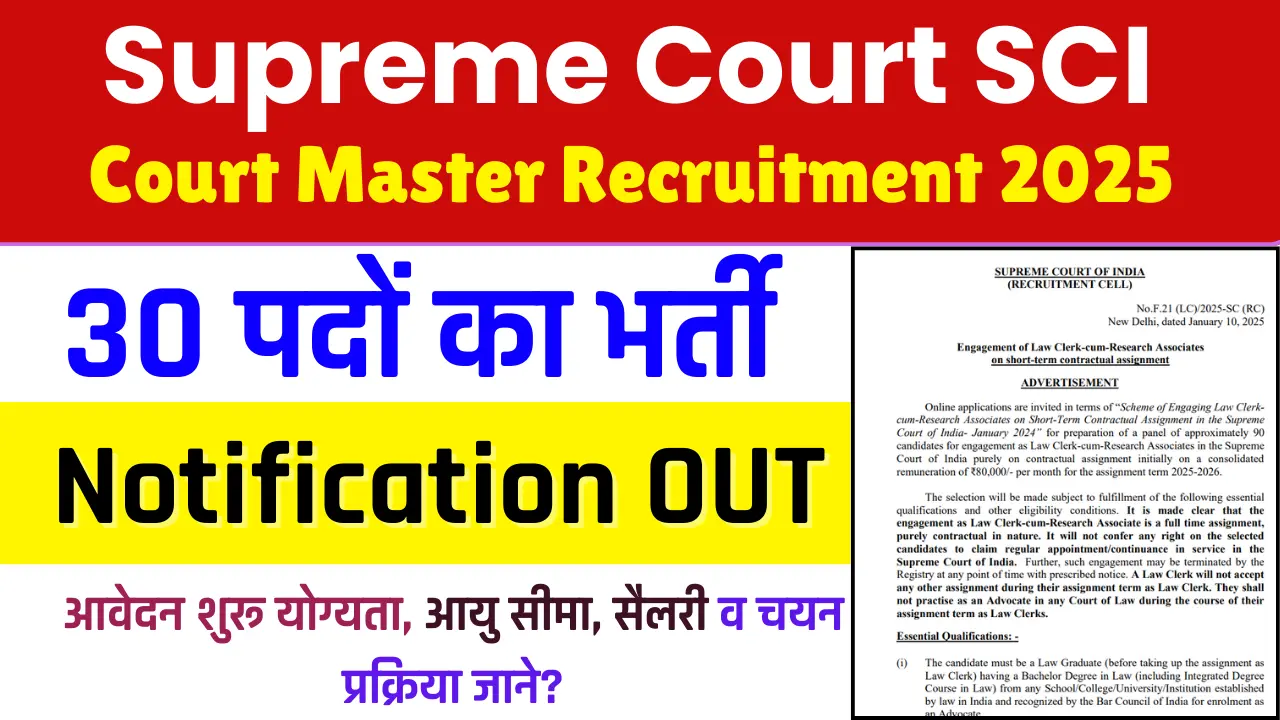 Supreme Court SCI Court Master Recruitment 2025 :- Supreme Court of India (SCI) ने कोर्ट मास्टर (Shorthand) पदों पर भर्ती....