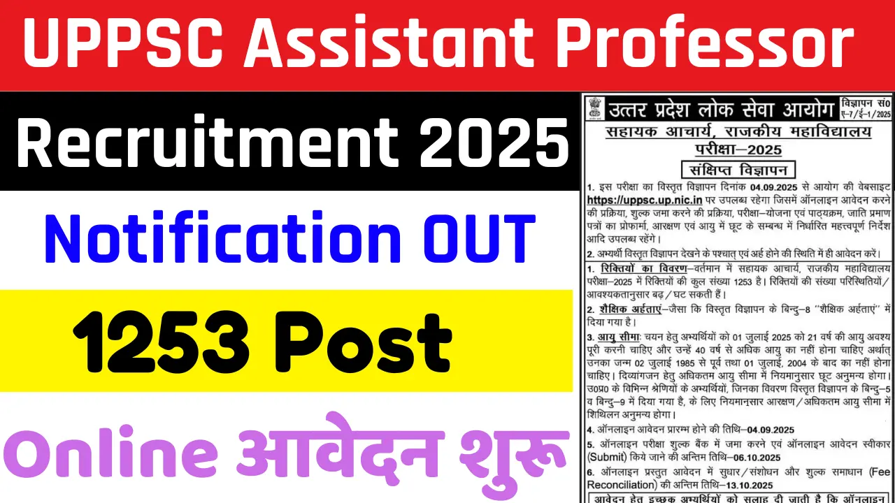 UPPSC Assistant Professor Recruitment 2025 :- उत्तर प्रदेश लोक सेवा आयोग (UPPSC) ने असिस्टेंट प्रोफेसर भर्ती 2025 का आधिकारिक नोटिफिकेशन....