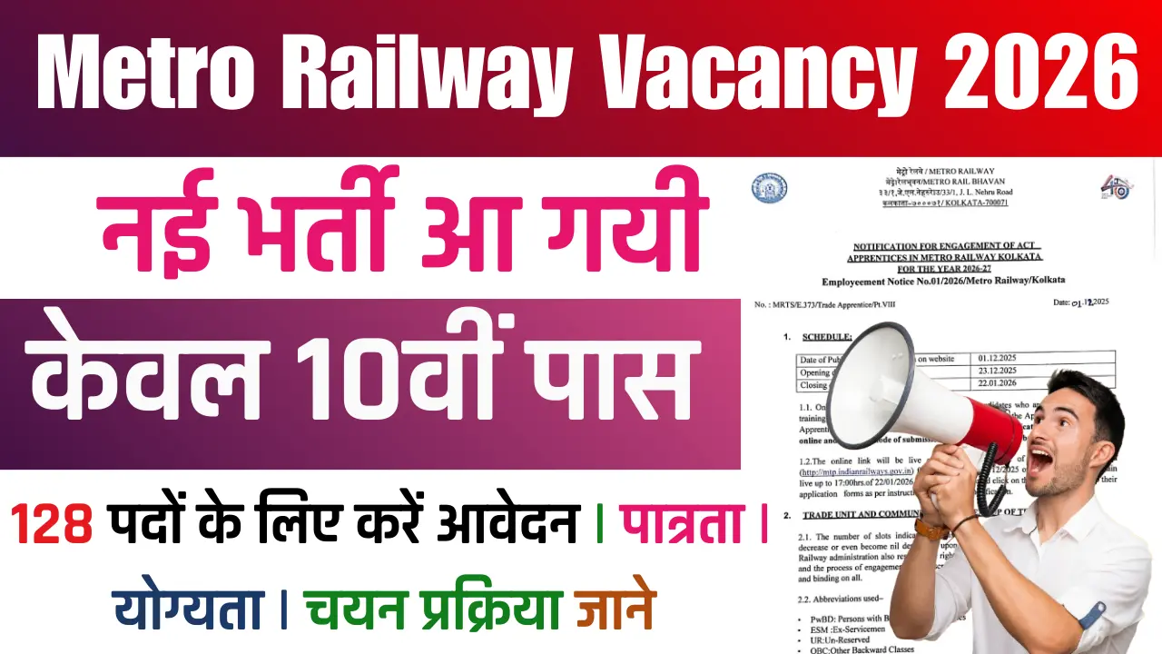 Metro Railway Kolkata Recruitment 2026 :- रेलवे में नौकरी करने का सपना देख रहे हैं युवाओं के लिए एक सुनहरा....