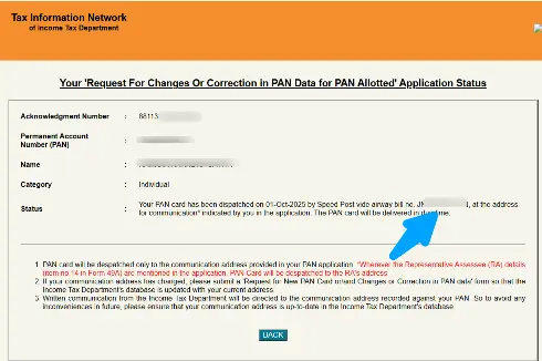 अगर आपके पैन कार्ड का स्टेटस Dispatched दिखाता है, तो आप स्पीड पोस्ट से इसकी डिलीवरी को भी ट्रैक कर सकते हैं।