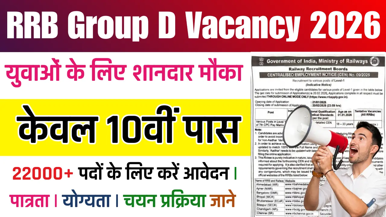 RRB Group D Vacancy 2026 :- क्या आप भारतीय रेलवे में ग्रुप डी के पद पर सरकारी नौकरी प्राप्त करना चाहते हैं? तो आपके लिए एक बड़ी खुशखबरी है। रेलवे रिक्रूटमेंट बोर्ड (RRB) द्वारा ग्रुप डी के 22,000 रिक्त पदों पर भर्ती के लिए शॉर्ट नोटिस जारी कर दिया गया है। इस भर्ती के लिए इच्छुक उम्मीदवार 21 जनवरी 2026 से 20 फरवरी 2026 तक ऑनलाइन आवेदन कर सकेंगे। यह भर्ती लाखों युवाओं के लिए रेलवे में नौकरी पाने का सुनहरा अवसर है।