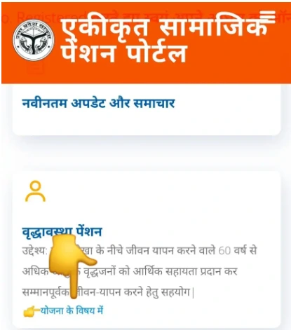 • स्क्रोल करके वृद्धावस्था पेंशन सेक्शन ढूँढें — पेज पर नीचे या मेनू में अपना योजना (वृद्धावस्था पेंशन) चुनें।
