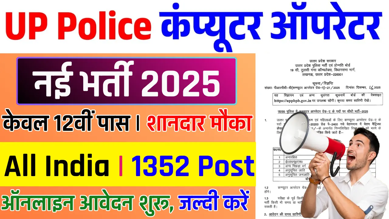UP Police Computer Operator Vacancy 2025-26 :- अगर आप कंप्यूटर ऑपरेटर की सरकारी नौकरी करना चाहते है तो आपके लिए बड़ी खुशखबरी आ चूका है उत्तर प्रदेश पुलिस की ओर से कंप्यूटर ऑपरेटर के 1352 पदों पर भर्ती के लिए आधिकारिक अधिसूचना जारी कर दी गई है जिसमें कि उम्मीदवार 16 दिसंबर 2025 से लेकर 15 जनवरी 2026 तक ऑनलाइन आवेदन कर पाएंगे।