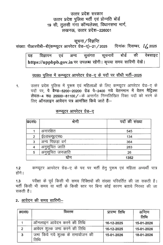 UP Police Computer Operator Vacancy 2025-26: 1352 पदों पर भर्ती, ऑनलाइन आवेदन शुरू