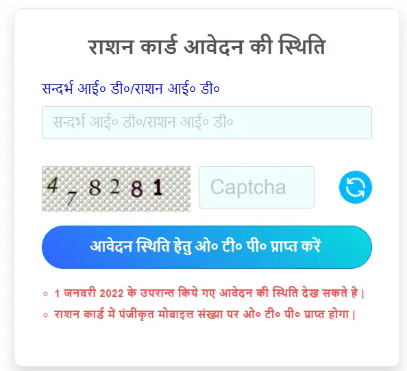 राशन कार्ड स्टेटस चेक करने के लिए आवेदन संदर्भ आईडी या राशन आईडी और Captcha डालकर OTP से सत्यापन करें।