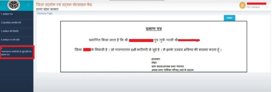 “परम्परागत कारीगरी से जुड़े होने का प्रमाण पत्र” डाउनलोड करें, ग्राम प्रधान या नगर पालिका से हस्ताक्षर करवाकर स्कैन कर अपलोड करें।