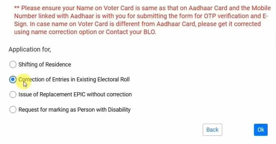 - अब नए पेज पर Correction of Entries in Existing Electoral Roll के ऑप्शन को सेलेक्ट कर OK पर क्लिक करें।